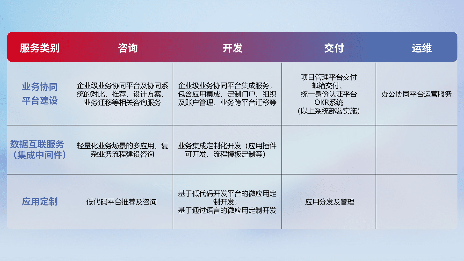 针对钉钉、、、企微、、、、IDaas等平台级产品提供产品的规划、、、、方案、、、交付、、、、定制化开发等服务,,实现如统一协同办公、、智能客户服务、、、、混合会议管理、、智能数据查询、、、等业务场景,,,实现数字化转型。。。。